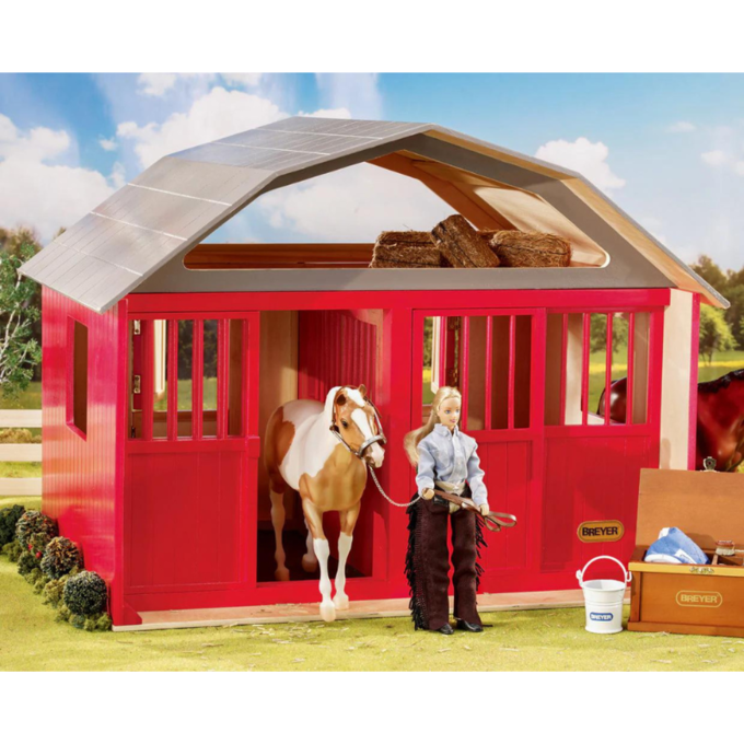 Introducing the Breyer Two-Stall Farm, the quintessential abode for your model horses! Crafted with meticulous attention to detail, this stunning red barn provides a cozy and spacious retreat for your equine companions. Whether you're a seasoned collector or just beginning your equestrian adventures, this barn is sure to capture your imagination.